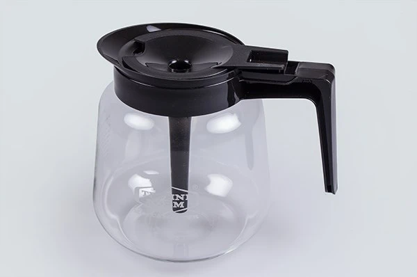 Glaskanne für Moccamaster Kaffeemaschine, mit schwarzem Griff und Deckel.