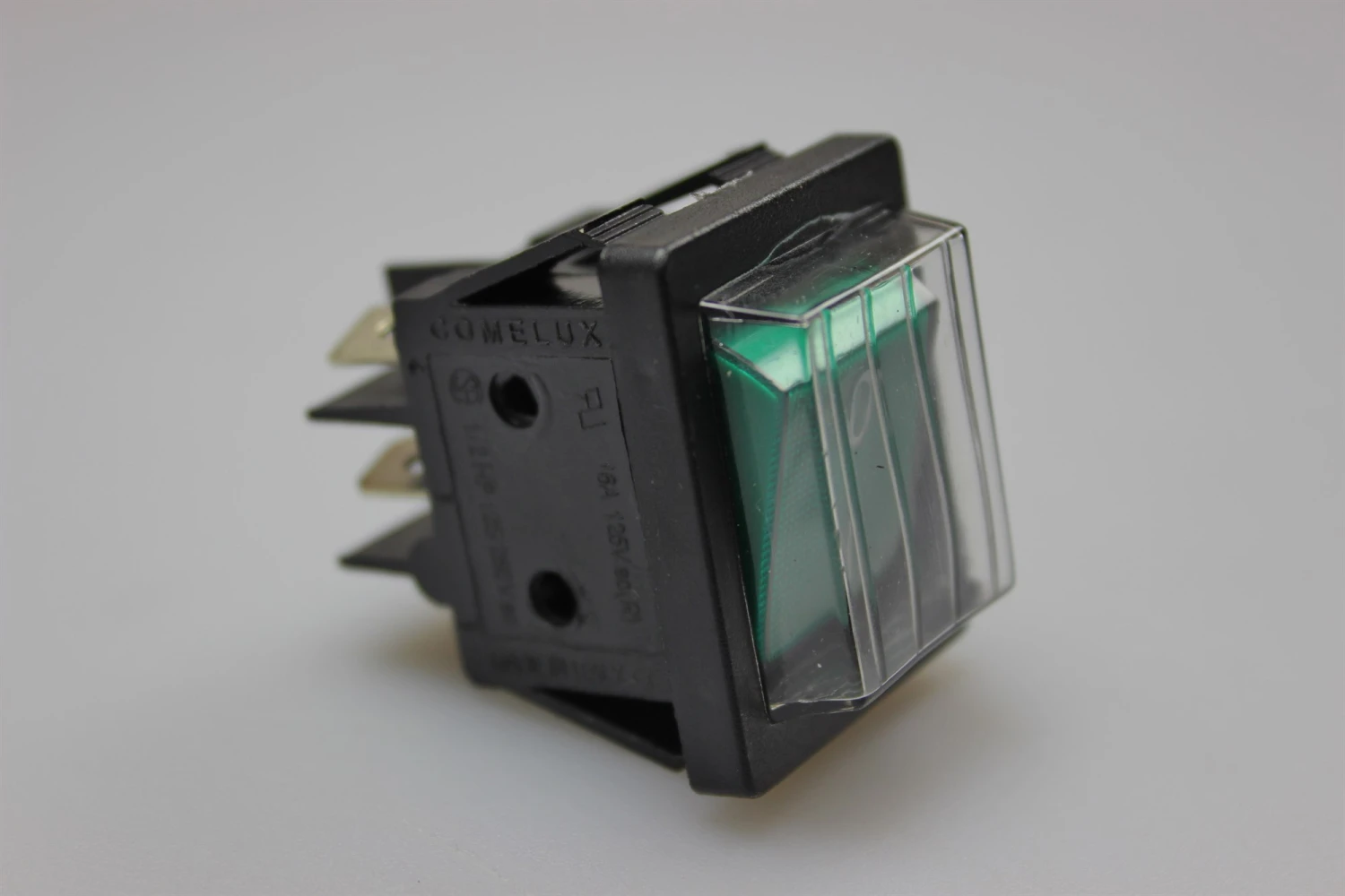 Doppelter Wippenschalter, grün m. Licht, schwarzes Gehäuse, und Gummikappe.